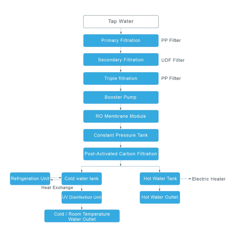 The Mejec-PS-HC features advanced Multistage filtration combined with Multi-Stage Sterilization technology. This comprehensive process effectively removes sediments, chlorine, heavy metals, and bacteria, ensuring safe and refreshing drinking water. The system's Instant heating capabilities also act as a thermal disinfection step, providing an extra layer of safety. Whether for tea, coffee, or cold drinks, you can trust the water quality is reliable and clean.