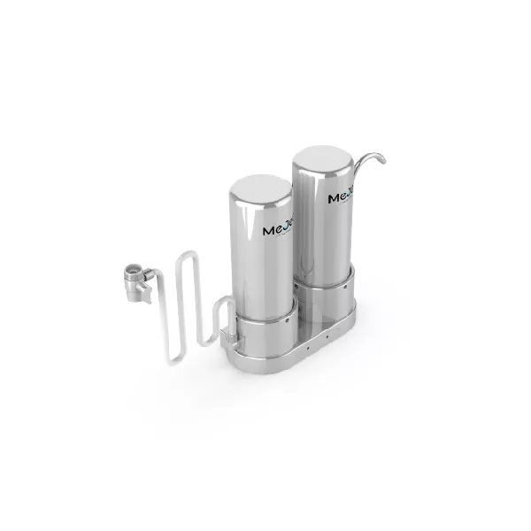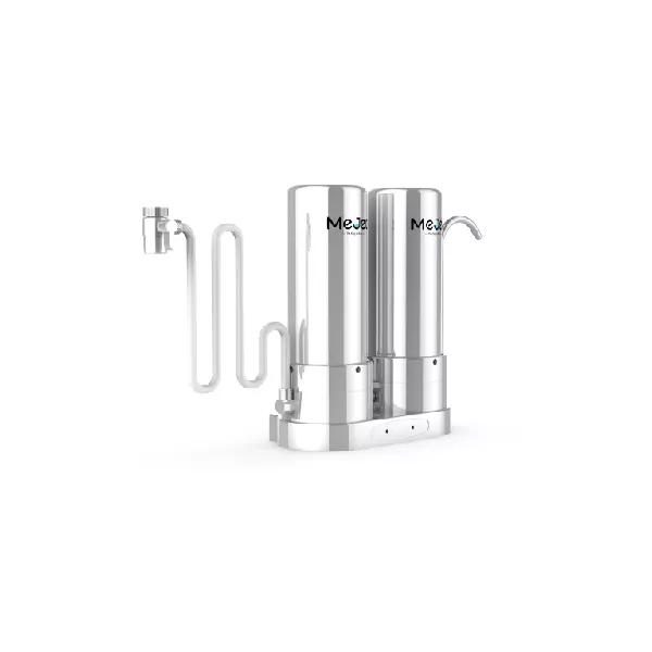 Mejec dual RO filter system, designed to deliver twice the purity. Featuring two professional-grade reverse osmosis cartridges in sequence, this compact countertop solution removes sediments, chlorine, heavy metals and micro-impurities. The result is 99.9% pure drinking water that is crisp, safe, and surpasses standard single-stage systems.